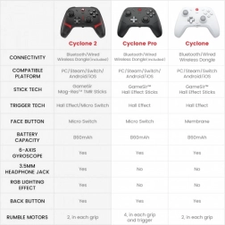 Ontdek ongeëvenaarde precisie en hoge prestaties met de draadloze GameSir Cyclone 2-controller. Biedt drie verbindingsmodi (2,4 GHz, Bluetooth, bekabeld), multiplatformcompatibiliteit (Switch, PC, Android, iOS), nieuwe Mag-Res TMR-sticks, analoge Hall-effect-triggers, een 6-assige gyroscoop, meeslepende vibraties en RGB-verlichting voor de ultieme game-ervaring.