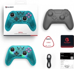 De multiplatformcontroller GameSir Nova in de kleur Neon Teal biedt nauwkeurige Hall Effect-sticks zonder drift, drie modi voor verbinding (Bluetooth, 2,4 GHz-dongle, USB‑C) en brede compatibiliteit met SWITCH, pc, iOS en Android. Geniet van RGB-ringen, duale vibraties, motion control en achterzijde programmeerbare knoppen voor maximale prestaties.