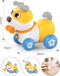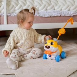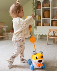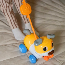 De schattige interactieve hond van het merk WOOPIE is een geweldige metgezel voor de eerste stapjes en voor dagelijks spelen. Dankzij de functie 2-in-1 – duwen en trekken past hij zich gemakkelijk aan het tempo van het kind aan, terwijl hij blaft en vrolijke geluiden maakt. De elastische handgreep zorgt voor soepele bewegingen in alle richtingen en de draaiende oortjes en staart 360° stimuleren nieuwsgierigheid en coördinatie. Er is ook een schattig bot om te “voeren”, wat de fantasie en rollenspel bevordert.
