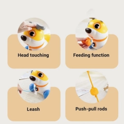 Het hondje blaft en maakt realistische geluiden, reageert op aanraking en laat na het “voeren” met het meegeleverde botje zijn blijdschap zien. Draaiende oortjes en staart 360° verhogen de sensorische stimulatie, terwijl de elastische handgreep zorgt voor een vloeiende beweging over de vloer zonder haperen – thuis en op tapijt.