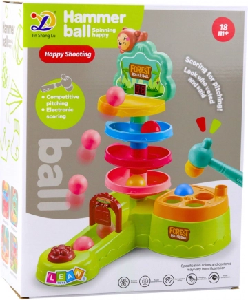 De knikkerbaan is gemaakt van veilige, kleurrijke en duurzame materialen die de aandacht trekken en uitnodigen tot spelen. Begin het spel door een van de vier knikkers bovenaan de baan te plaatsen. Het kind houdt de knikker in beweging met een tik van het hamertje en kijkt hoe deze naar beneden rolt, wat de coördinatie en het begrip van oorzaak en gevolg ontwikkelt.