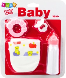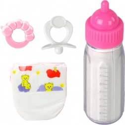 De set bevat een doorzichtige babyfles met witte vulling die melk imiteert, een klassieke speen, een zachte luier versierd met roze motieven en een rammelaar. De compacte afmetingen van deze accessoires zorgen voor een gemakkelijke grip en plezierig spel.