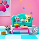 Deze themaset brengt drie gestileerde kattenhuisdiertjes en alles wat je nodig hebt voor een relaxte “film & snack”-scène: mini-laptop, tafeltje en smakelijke hapjes – frietjes, sushi, burger en popcorn. Dankzij de kleurrijke details en sfeervolle accessoires bedenken kinderen makkelijk hun eigen verhalen en settings.