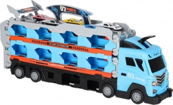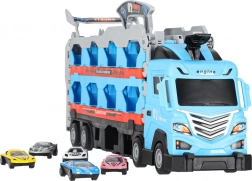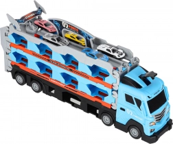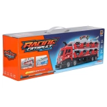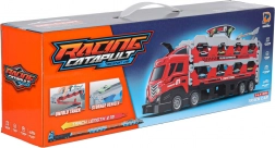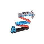 Deze multifunctionele set combineert een autotransporter en een lange racebaan in één. Uitgeklapt wordt de truck een dubbele baan van 210 cm, waarop kinderen spannende duels kunnen houden en records kunnen meten.