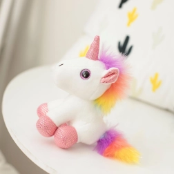 Deze schattige pluchen eenhoorn in sleutelhanger vorm is een ideaal accessoire voor een rugzak, tas of sleutels. Wit pluche met paarse details, regenboogmanen en een glinsterende hoorn trekt ieders aandacht.