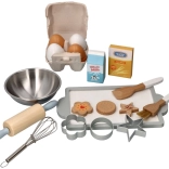 De deegroller, garde, kwastjes, uitsteekvormpjes en kom laten kinderen echt bakken nabootsen en het hanteren van gereedschap oefenen.