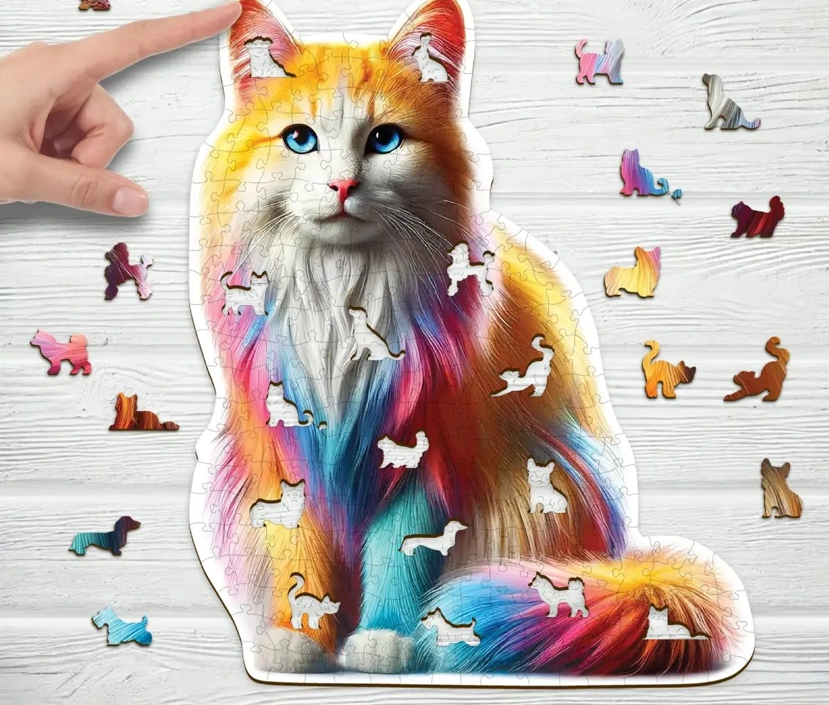 WOODEN CITY houten puzzel Regenboogkat is geweldig vermaak voor elke puzzelliefhebber. Speciaal gevormde stukjes en een milieuvriendelijke verpakking zorgen voor een uitzonderlijke legervaring.