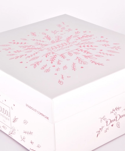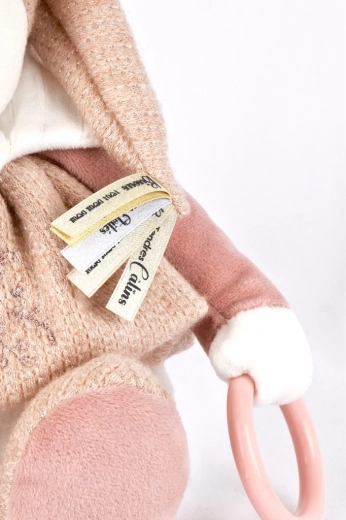 De pluche ijsbeer heeft een zachte roze muts versierd met satijnen linten met liefdevolle boodschappen in het Frans. Het lijfje is gemaakt van zacht materiaal met een fijne borduursel van het merk Doudou. Het beertje biedt verschillende prikkels voor de ontwikkeling van de zintuigen en de fijne motoriek: