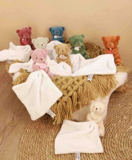 De kleine pluche teddybeer met dekentje is de perfecte metgezel voor een baby, klaar om zachtheid en comfort te brengen, dag en nacht. Kies uit 8 zachte kleuren voor plezier en vreugde voor zowel kinderen als ouders.