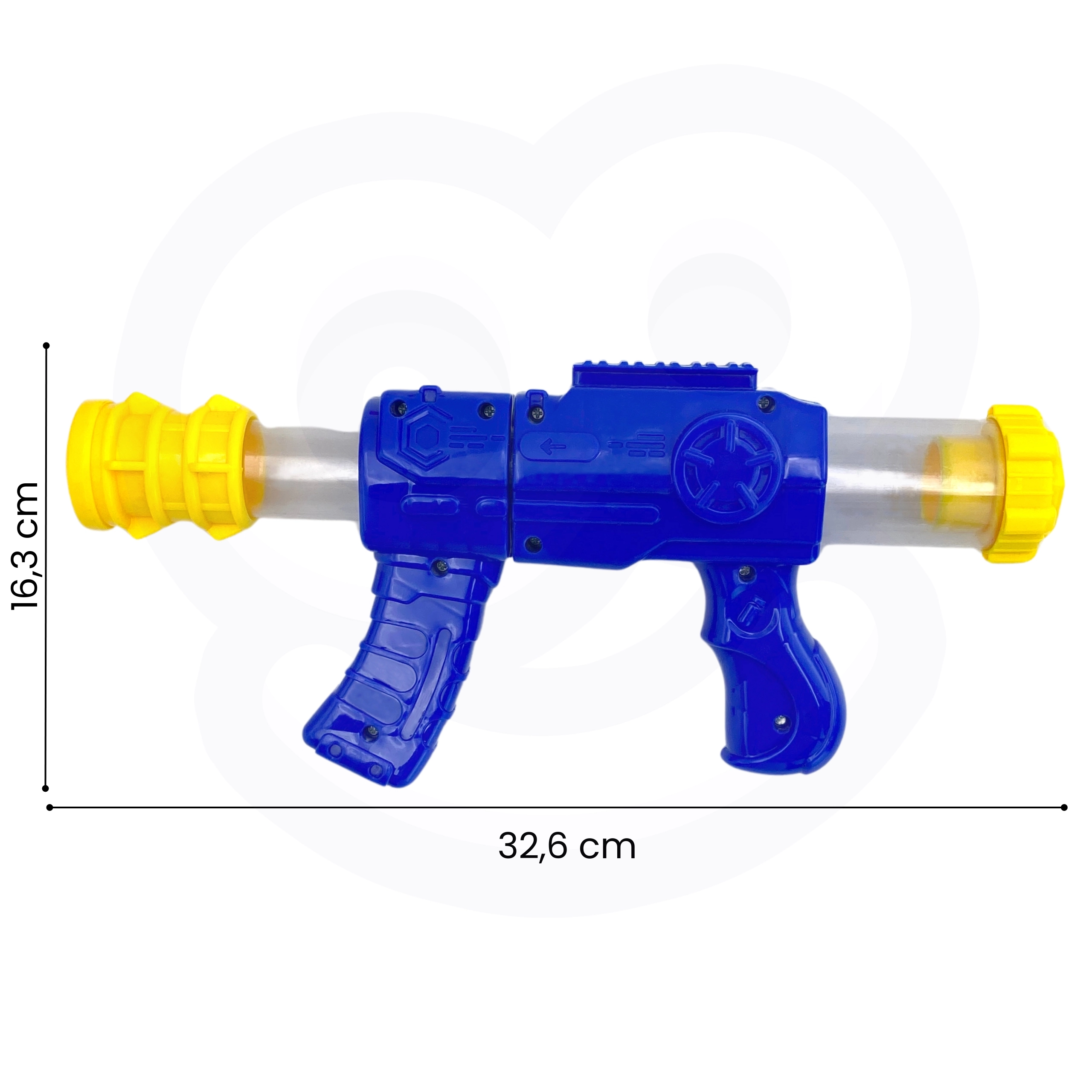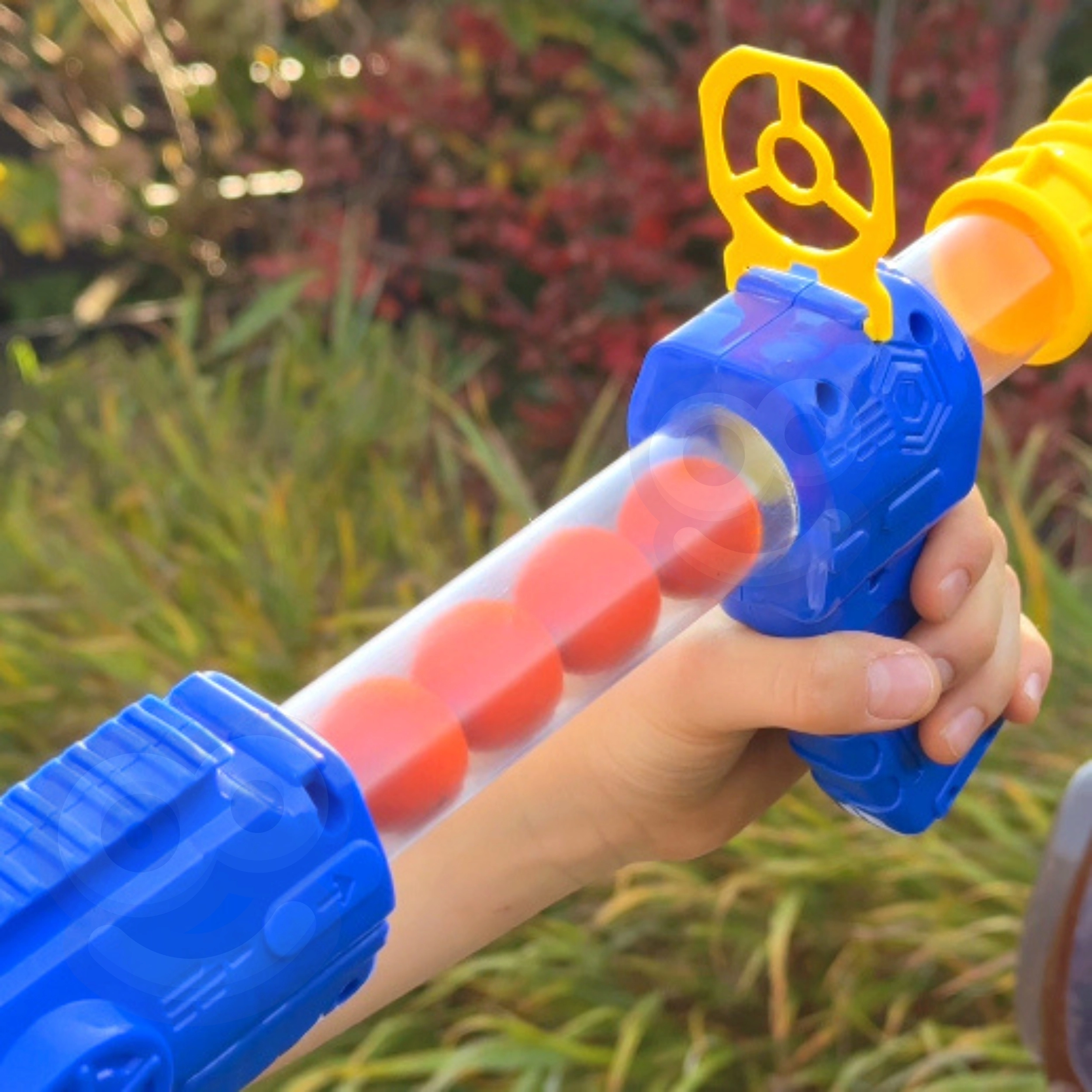 - - De pistool wordt door lucht aangedreven; duw de kolf naar je toe en het balletje wordt afgevuurd