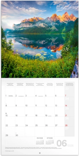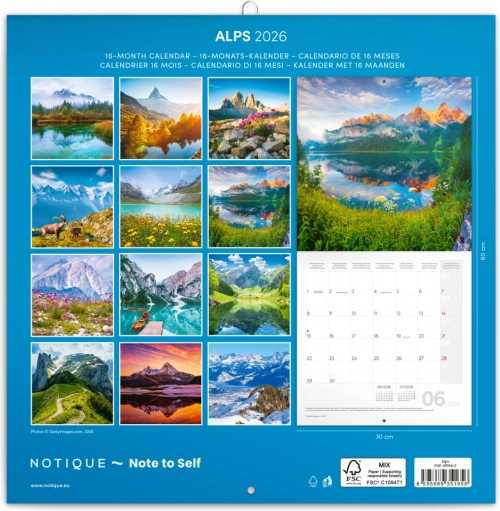 Notitiekalender Alpen 2026 met 12 adembenemende foto’s, kalendarium en ruimte voor notities.