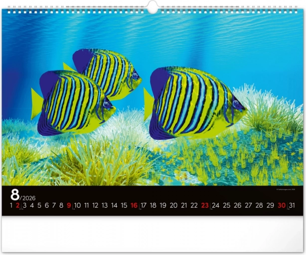 Mei brengt een beeld van een koraalparadijs met bontgekleurde vissen, die de kalender heldere en levendige kleuren geven. Deze maand straalt optimisme en schoonheid uit.