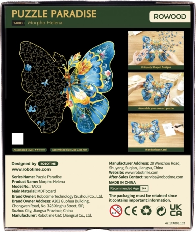 RoboTime Houten puzzel Vlinder Morpho Helena biedt een uitdaging voor je brein, ondersteunt de fijne motoriek en probleemoplossende vaardigheden. Tijdens het leggen stimuleert het logisch denken en voegt het een uniek decoratief element toe aan je huis of kantoor.