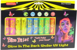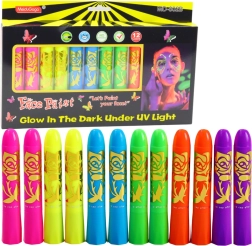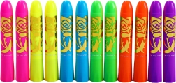 De set bevat 12 stiften in intense, fluorescerende kleuren – twee van elke kleur, wat delen met broers, zussen of vrienden mogelijk maakt. De stiften zijn perfect voor dagelijks spelen, thematische feesten, verjaardagen, carnaval, festivals en Halloween.