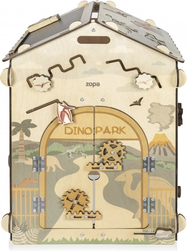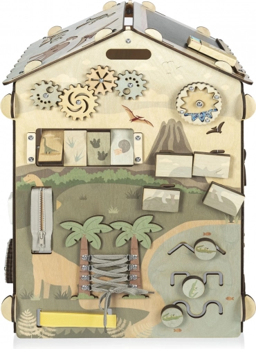 Het dak dient als zwart krijtbord, 3D dino-puzzels ondersteunen ruimtelijk inzicht en draaibare plaatjes met sporen stimuleren aandacht en logisch denken. Praktische elementen zoals ritsen, veters, tandwielen en doolhoven helpen zelfstandigheid te ontwikkelen.