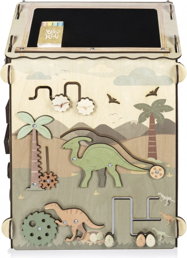 Dit stabiele en mooi geïllustreerde huisje (ca. 61 × 40 cm) is ontworpen als een interactieve speelruimte waar kinderen principes van oorzaak en gevolg ontdekken, oog-handcoördinatie trainen en hun verbeelding ontwikkelen. Het dinothema prikkelt natuurlijke nieuwsgierigheid en maakt van leren een spel.
