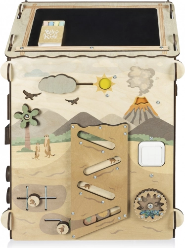 Elke wand brengt een nieuwe uitdaging: doolhoven, tandwielen, draaiplaten, knikkerbaan, maar ook praktische elementen zoals ritsen, veter om door te rijgen, klittenband en een mechanische schakelaar. Op het dak is er een zwart krijtbord met een gootje voor krijt – kinderen tekenen, wissen en creëren opnieuw.