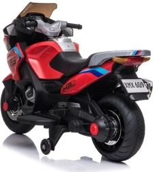 Deze sportieve versie van de kindermotor trekt de aandacht niet alleen door zijn opvallende kleurstelling, maar ook door de stevige constructie en de afwerking in de stijl van echte motorfietsen. Verchroomde elementen in de stijl van een uitlaatsysteem geven de motor extra uitstraling en spreken elk kind aan. Zijwieltjes maken het besturen eenvoudiger voor kinderen die nog leren hun evenwicht te bewaren. Nog nooit was dit plezier zo eenvoudig!