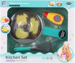 Inhoud van de set: Pan, ketchupflesje, spatel en drie imitatietenswaren.