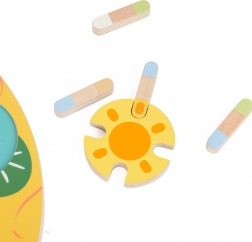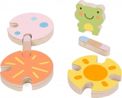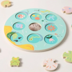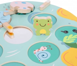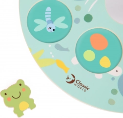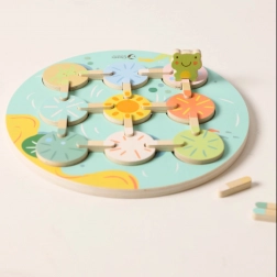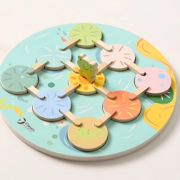 De kleurrijke houten kikker en de zachte pasteltinten geven het spel esthetische waarde en ondersteunen het herkennen van kleuren.
