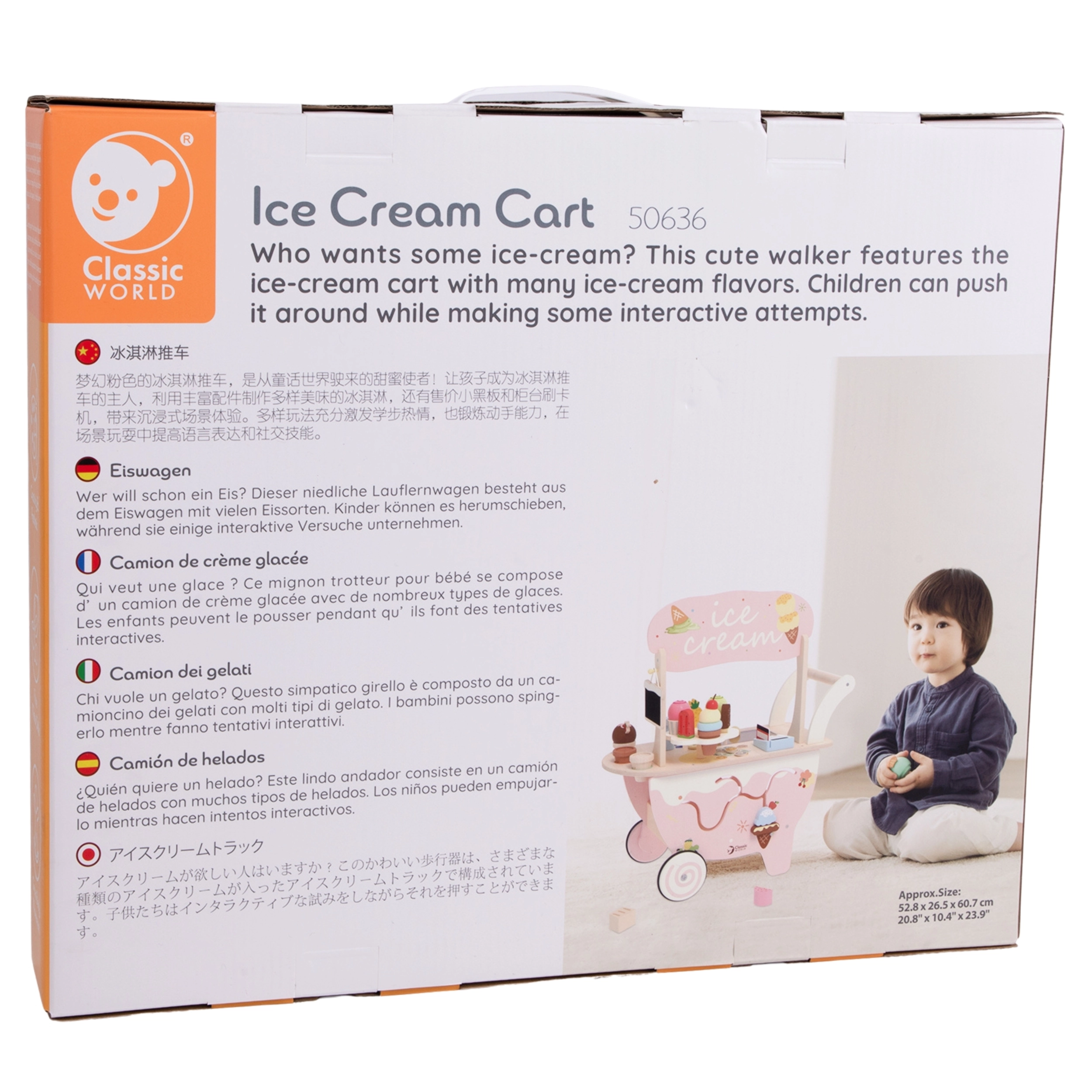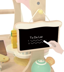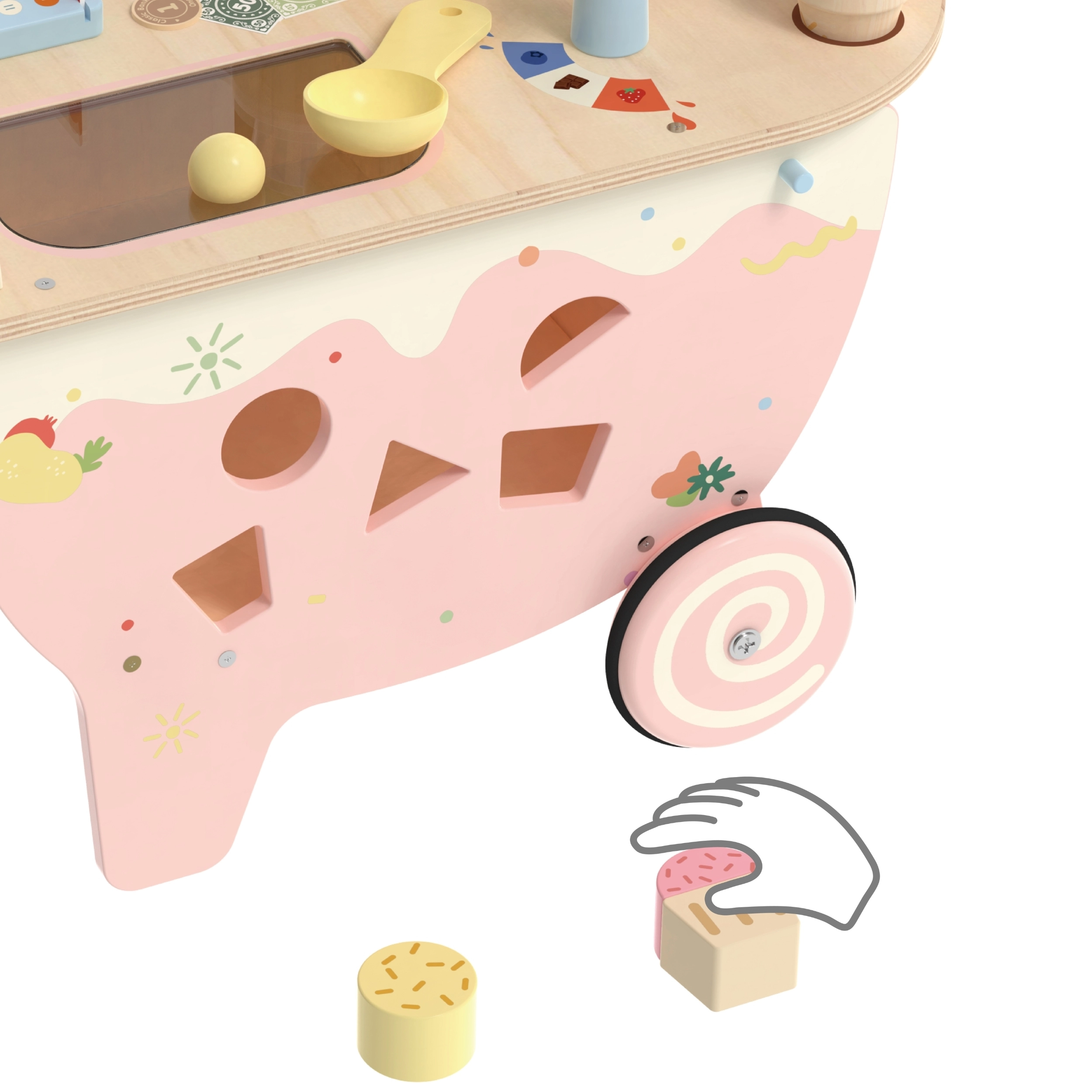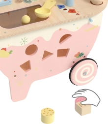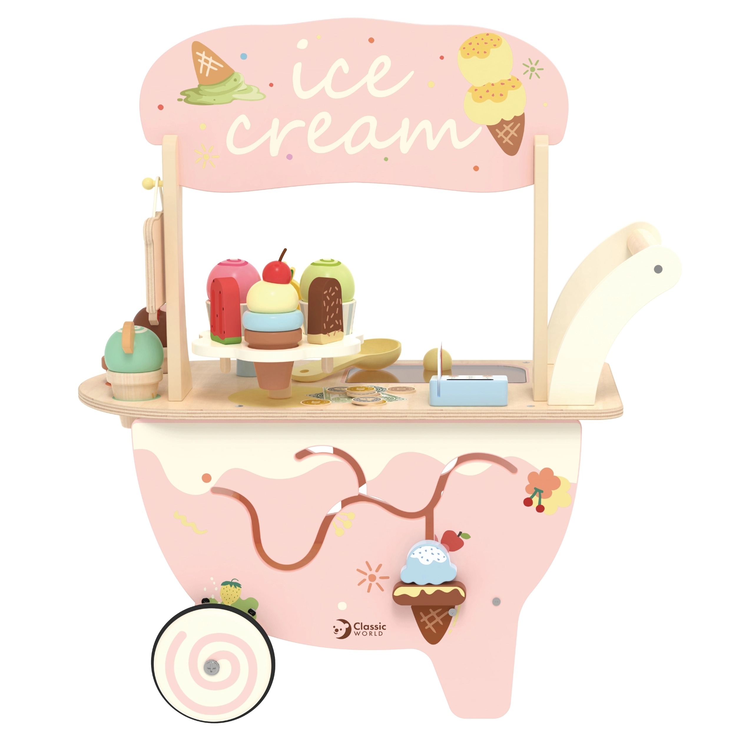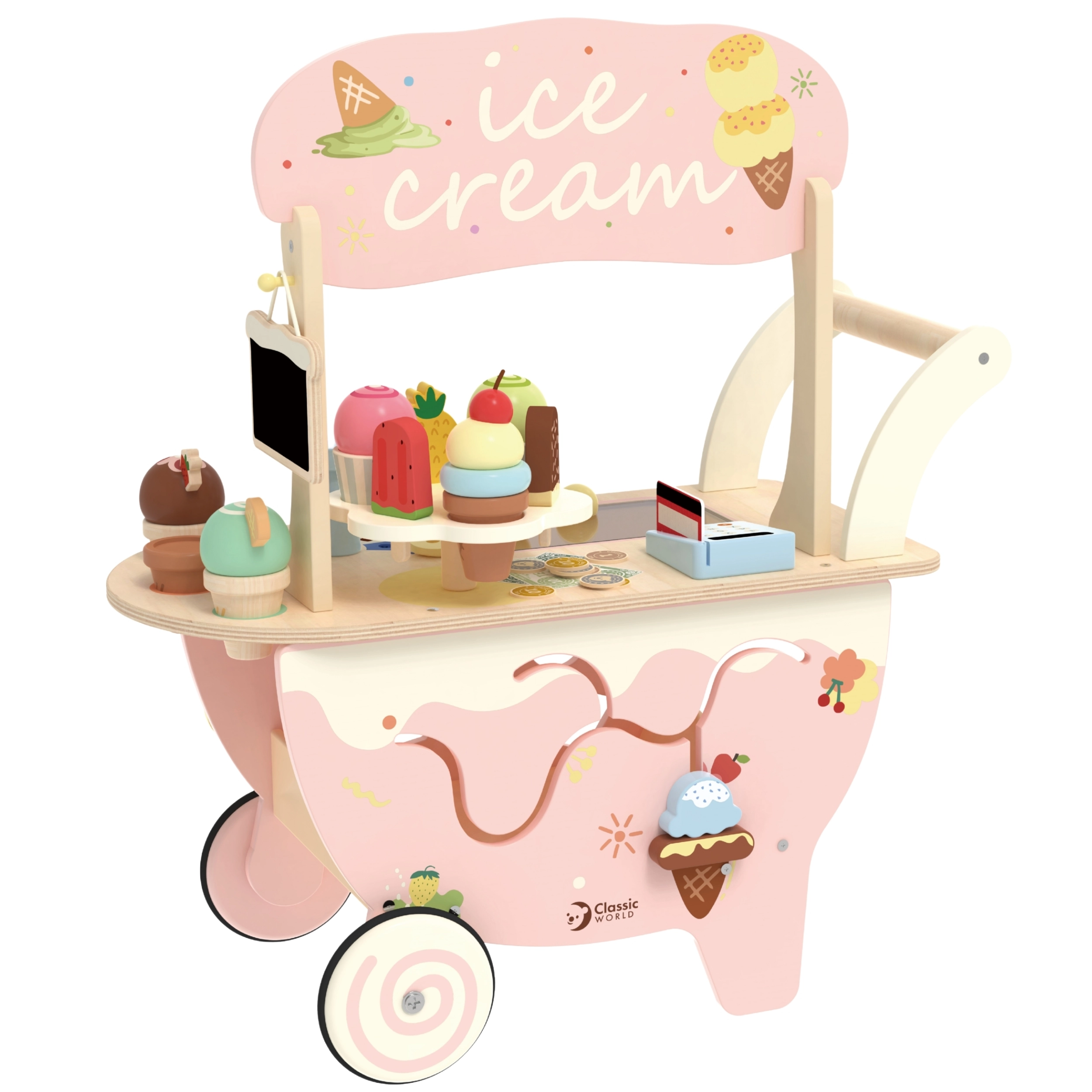 We presenteren de houten ijssalon 3-in-1 van Classic World, ideaal voor kinderen vanaf 3 jaar. Dit multifunctionele speelgoed dient niet alleen als ijssalon, maar ook als sorteerspel, doolhof en krijtbord. Het is gemaakt van duurzame en veilige materialen, met pastelkleuren en decoratieve prints die elke kleine verkoper aanspreken. Dankzij de rijke set ijsgarnituren, waaronder verschillende smaken, toppings en hoorntjes, kunnen kinderen zich volledig onderdompelen in rollenspellen als winkel of ijssalon.