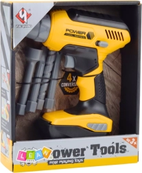 De set bevat 4 verwisselbare bits: boor, platte schroevendraaier, kruiskopschroevendraaier en sleutel. Kinderen kunnen het gereedschap aanpassen aan hun ‘reparaties’.