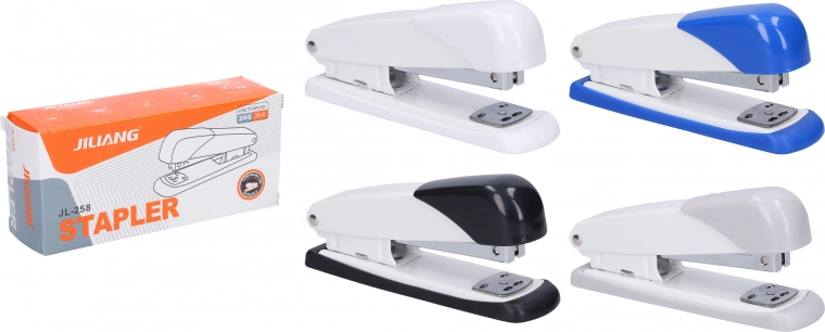 Universele nietmachine beschikbaar in vier kleurvarianten: blauw, grijs, wit en zwart, ideaal voor dagelijks gebruik.