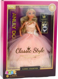 De pop Anlily in poederroze avondjurk oogt uitzonderlijk dankzij een waaierachtige decoratieve ruches en een sierlijke strik. Ze heeft lang blond haar dat kan worden gekamd en gestyled, en haar subtiele make-up en uitgesproken gelaatstrekken geven de pop een warme en elegante uitstraling. Met beweegbare ledematen – armen, benen en hoofd – is de pop ideaal voor dynamisch spel, omkleden en het creëren van dagelijkse en sprookjesachtige verhalen.