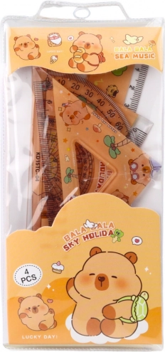 De set bevat 4 essentiële hulpmiddelen: een liniaal, geodriehoeken van 45° en 60° en een gradenboog. Deze set is gemaakt van duurzaam en transparant plastic, wat zorgt voor een duidelijke schaalverdeling en nauwkeurigheid in gebruik. Verpakt in een hersluitbaar etui met bijpassend kapibara-ontwerp.