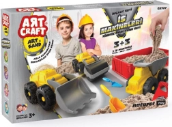 De set bevat diverse bouwvoertuigen en kinetisch zand.
