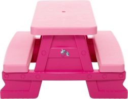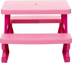Deze picknicktafel voor kinderen is gemaakt van opvallend roze kunststof dat niet alleen stijlvol oogt, maar ook gemakkelijk de aandacht van kinderen trekt.