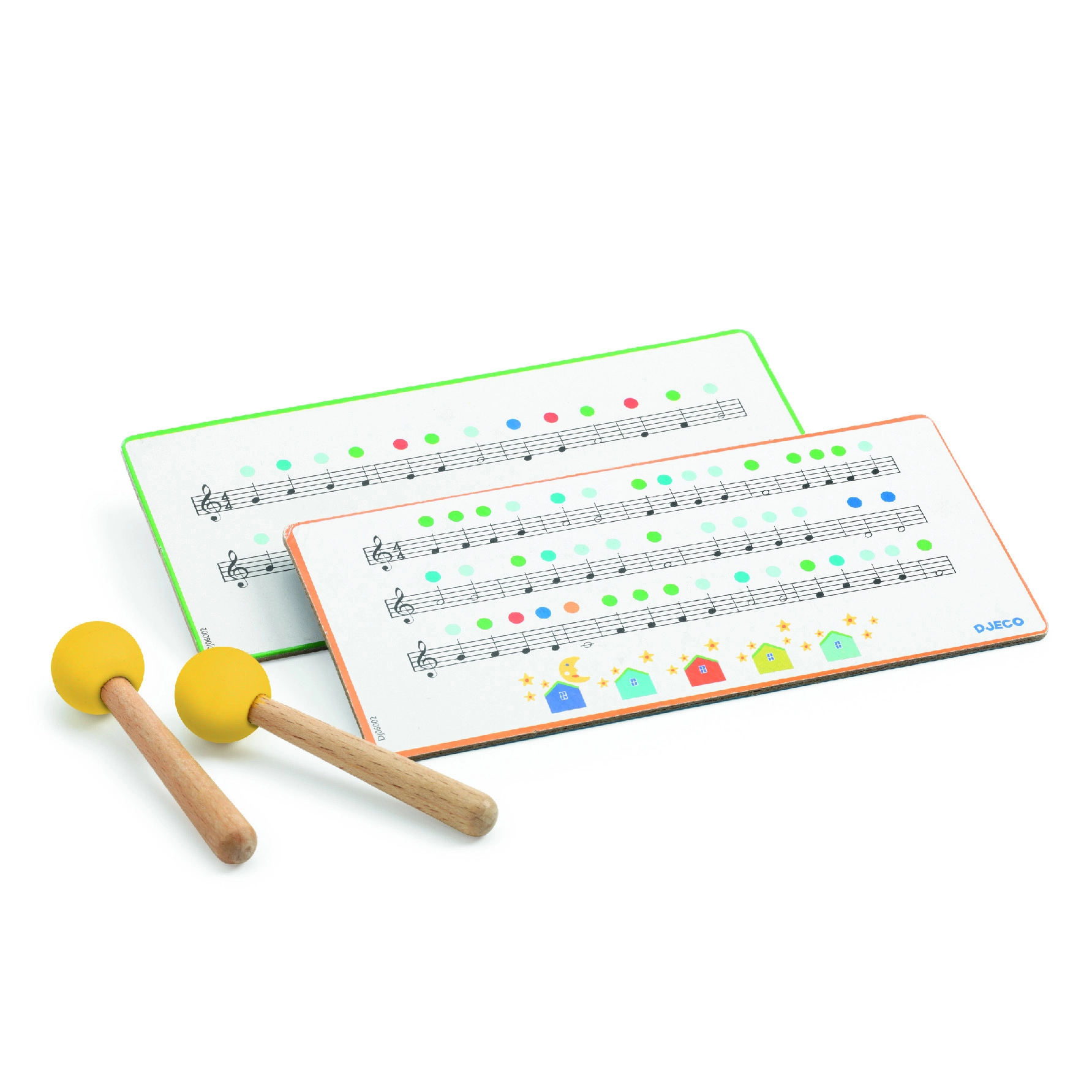 Genummerde tongen en de meegeleverde stokjes laten kinderen meteen prettige melodieën spelen, zonder voorafgaande ervaring.