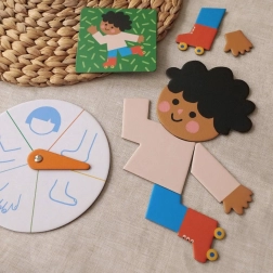 Draai aan de schijf en kies het stukje dat bij het figuurtje hoort. Kinderen leren op een natuurlijke manier de namen en plaats van de lichaamsdelen, op een leuke en speelse manier.