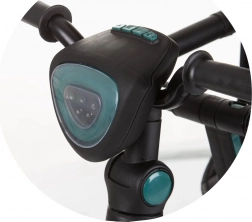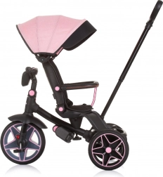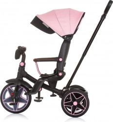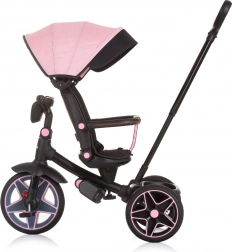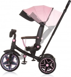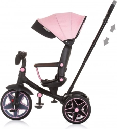 De in hoogte verstelbare duwstang en vrijlooppedalen stellen ouders in staat de driewieler onder controle te houden.