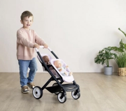 Sportieve tweelingpoppenwagen van het merk Smoby in een prachtig Quinny-design. Deze moderne wagen heeft afneembare zitjes en stille wielen, wat zorgt voor comfortabel gebruik.