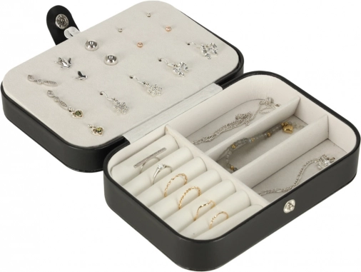 Elegant reissieradenkistje met doordachte indeling voor ringen, oorbellen, armbanden en kettingen. Compacte afmetingen, veilig drukknoopsluiting en zachte voering beschermen sieraden thuis en onderweg. Biedt 12 plaatsen voor ringen, paneel voor 10 paar oorbellen, vakjes voor kleine items en 5 haakjes met zakje voor kettinkjes.