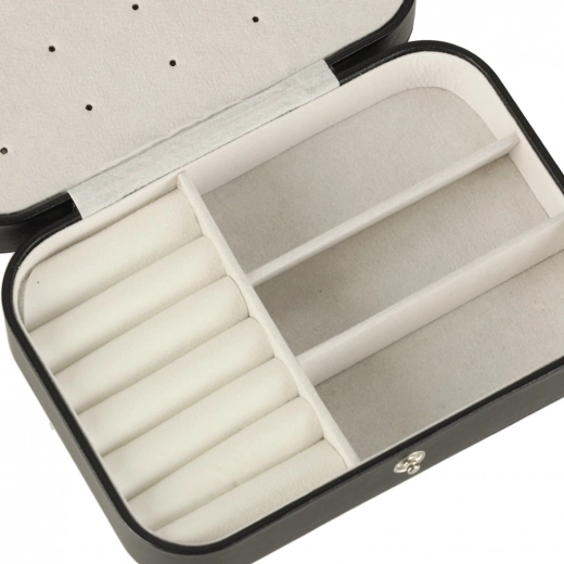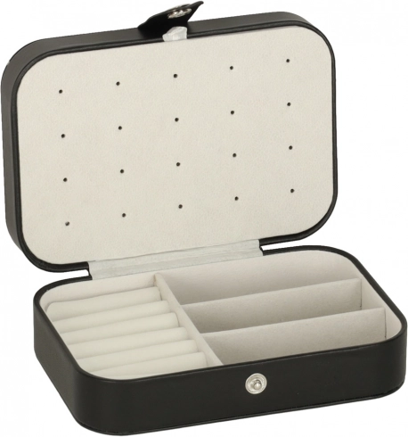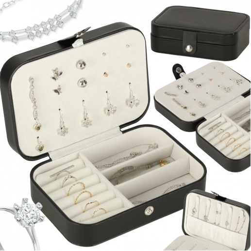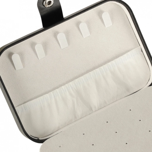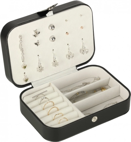 Deze stijlvolle sieradendoos in klassiek zwart met contrasterend licht interieur combineert modern design en praktische functionaliteit. De zachte voering beschermt delicate oppervlakken van sieraden en de doordachte indeling houdt alle accessoires overzichtelijk op hun plek. Ideaal voor in de handtas, koffer en op de kaptafel.