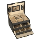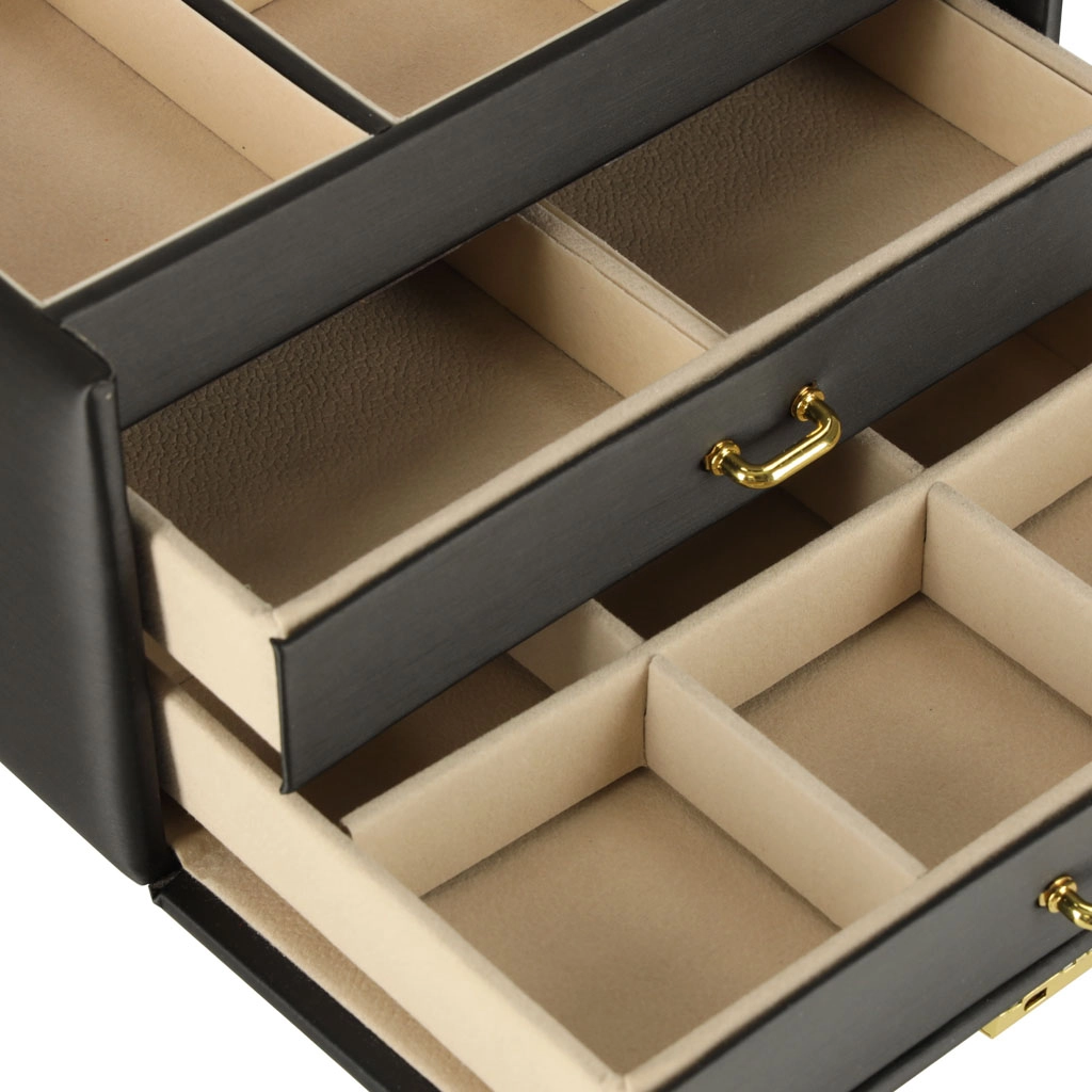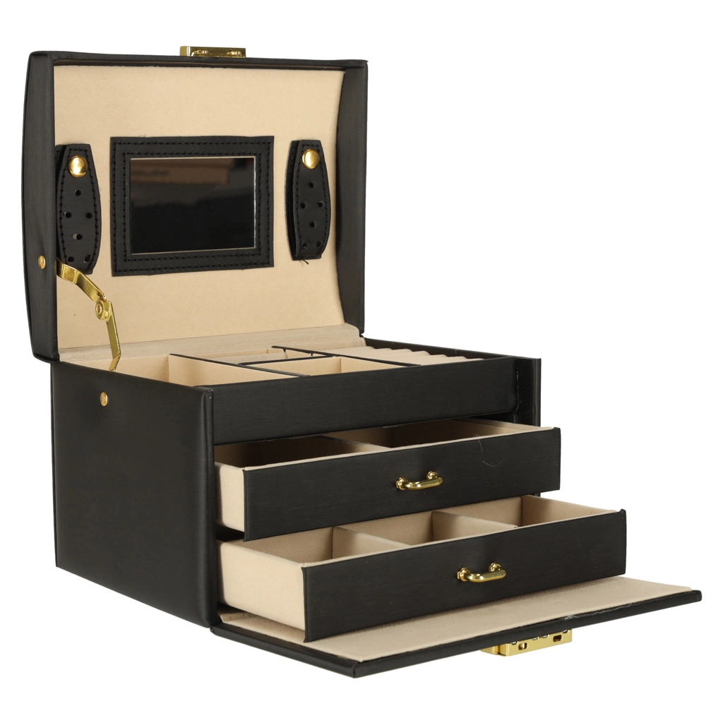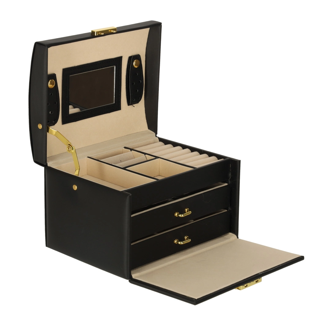 Elegante zwarte sieradendoos met spiegeltje en lades voor overzichtelijke opslag van ringen, oorbellen, armbanden en kettingen. Biedt ruime vakken, twee lades, zachte voering tegen krassen en sluiting met sleuteltje voor extra veiligheid. De ideale oplossing voor georganiseerde sieradenopslag thuis en onderweg.