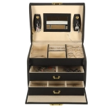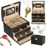 De slimme indeling omvat ringrollen, vakken voor kleine items en 2 uittrekbare lades met verdelers voor kettingen, armbanden en oorbellen. Sluiting met sleuteltje en een betrouwbare klapsluiting zorgen voor veilige opslag van kostbaarheden.