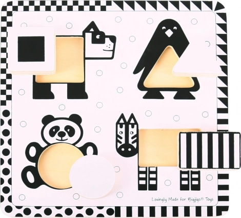 De zwart-witte inlegpuzzel van BIGJIGS TOYS is speciaal ontworpen voor de jongste kinderen. Het contrastrijke ontwerp helpt baby’s beter te focussen en vormen waar te nemen, terwijl vier royale houten puzzelstukken met dierenmotieven comfortabel in de bijbehorende openingen gelegd worden.