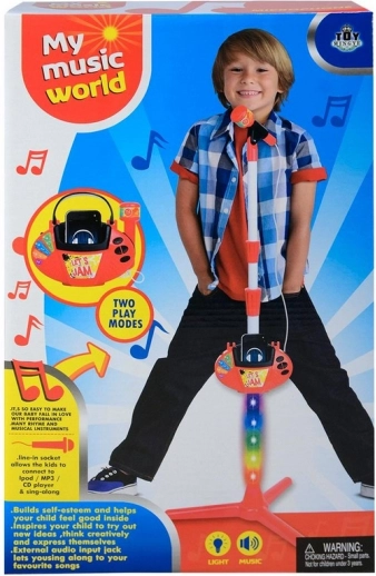 Word een podiumster met onze kindermicrofoon. Sluit een MP3-speler of smartphone aan op de bedieningsunit van de standaard en zing mee met je favoriete liedjes. De microfoon werkt op 3x AA 1,5 V batterijen en is geschikt voor kinderen vanaf 3 jaar.