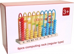 Negen staafjes, elk met tien houten kralen, maken optellen en aftrekken eenvoudig.