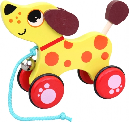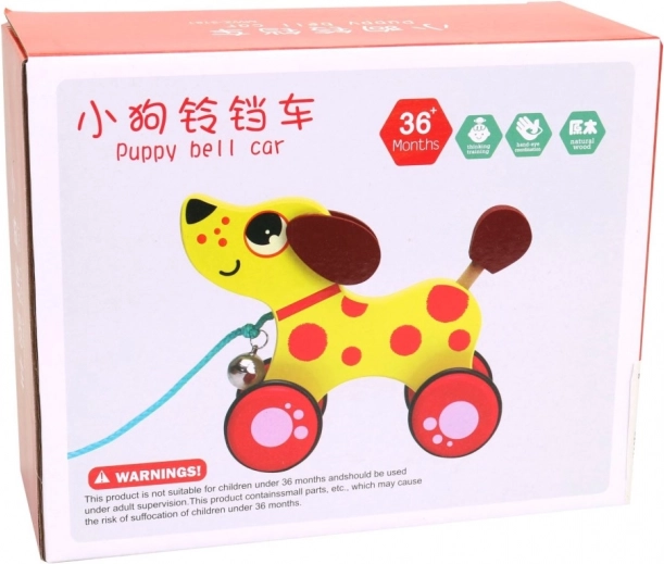 Houten trekhond 17 cm met aantrekkelijke kleuren en een belletje, geschikt voor kinderen vanaf 3 jaar.
