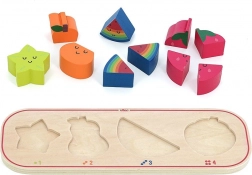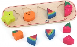 Deze leuke en educatieve puzzel brengt kinderen plezier in het ontdekken en leren via spel. Elk fruitstuk, zoals de gele carambola, oranje peer, kleurrijke watermeloen en rode aardbei, komt in een verschillend aantal stukjes om in de houten ondergrond te plaatsen. Kinderen leren vormen, kleuren en bijbehorende cijfers herkennen, wat op natuurlijke wijze hun fijne motoriek en oog-handcoördinatie bevordert.