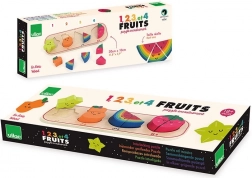 Inlegpuzzel Ik Leer Tellen met Fruit is een houten spel voor kinderen dat hen kennis laat maken met de cijfers 1 t/m 4 en hun motorische vaardigheden ontwikkelt met behulp van kleurrijke fruitstukken.