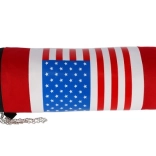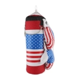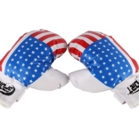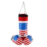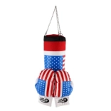 De bokszak en handschoenen zijn ontworpen met een motief van de Amerikaanse vlag, wat een speelse en kleurrijke uitstraling geeft.