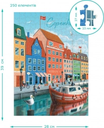 Puzzle DODO Steden: Kopenhagen biedt de mogelijkheid om de magie van een van de mooiste steden ter wereld te ervaren. Door deze 250 stukjes te leggen, geniet je van uren ontspanning en plezier terwijl je stap voor stap het prachtige beeld voltooit.