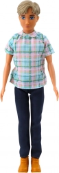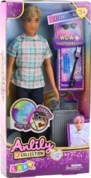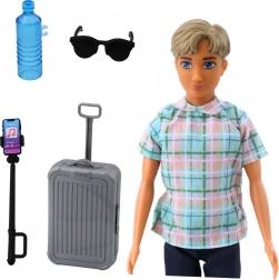 De Anlily jongenspop draagt een stijlvolle geruite blouse, donkerblauwe broek en bruine schoenen. Er zijn stijlvolle accessoires zoals een grijze koffer op wieltjes met uittrekbare handgreep, een selfiestick met telefoon, zonnebril en een waterfles.