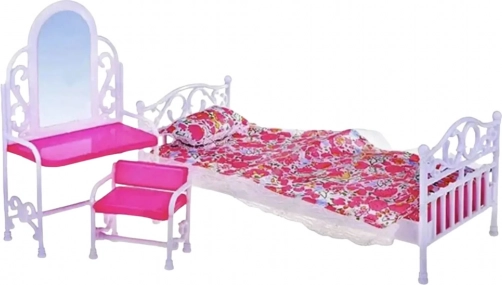 De slaapkamermeubelset voor poppen is een ideale aanvulling voor elk meisje dat graag met poppen speelt. De set bevat een elegant bed met kleurrijk beddengoed, een stijlvolle kaptafel met een grote spiegel en een stoel. De hele set is uitgevoerd in roze-wit, wat de aandacht trekt en perfect past in elk poppeninterieur.