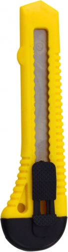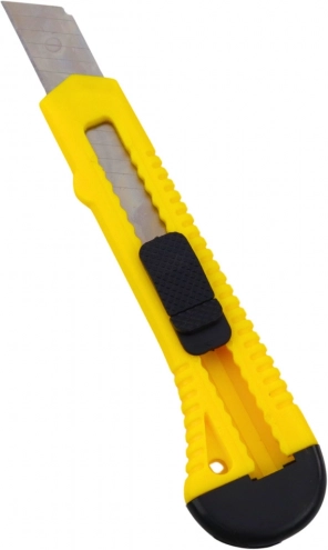 Gele segmenteermes 20 mm met ergonomische kunststof handgreep, ideaal voor het snijden van papier en karton.